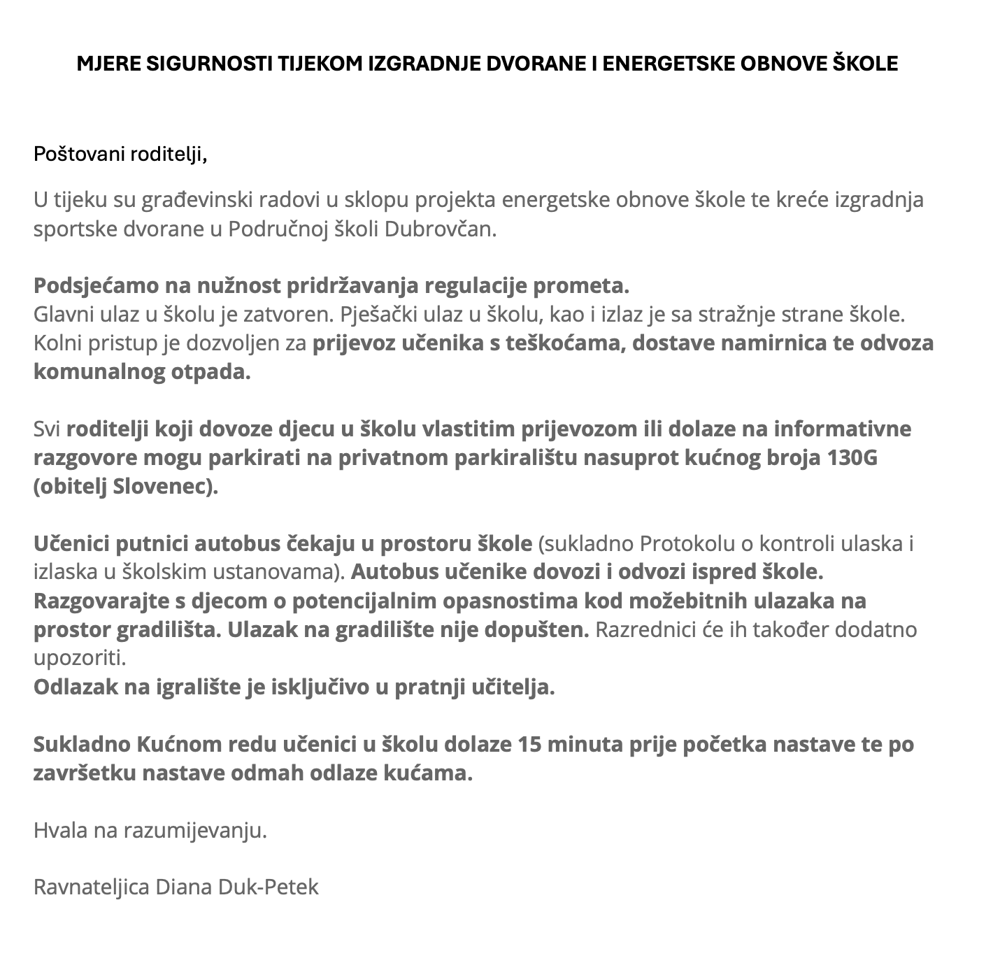 MJERE SIGURNOSTI TIJEKOM IZGRADNJE DVORANE I ENERGETSKE OBNOVE ŠKOLE